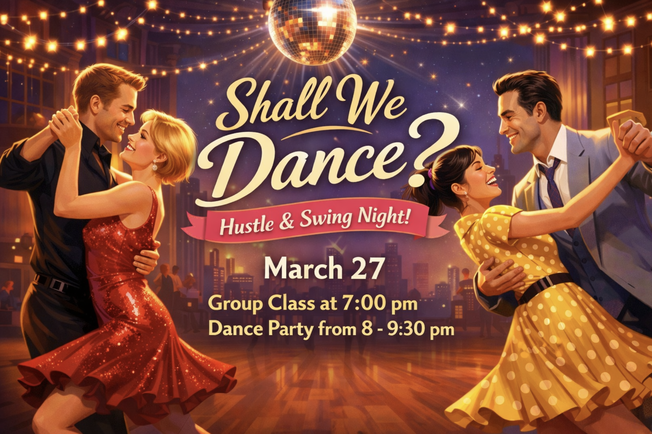 Join us March 27 for an evening of sparkling music and feel-good dancing as The Art of Ballroom presents Shall We Dance? — Hustle & Swing Night!